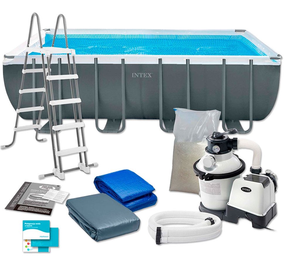 Piscine hors sol rectangulaire Intex 26356 Ultra Frame avec échelle, supports tubulaires, filtre à sable, couverture et toile de fond, parfaite pour profiter de l’été dans votre propre jardin.