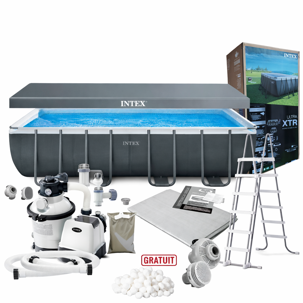 Contenu : piscine Intex Ultra Frame 732 x 366 x 132 cm bâche, tapis de sol et échelle de sécurité.